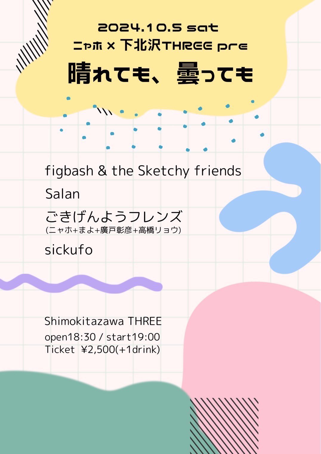 2024/10/05【ニャホ × 下北沢THREE presents.「晴れても、曇っても」】下北沢THREE live-ufo 2024.09.282024.10.04 ニャホ × 下北沢THREE presents.「晴れても、曇っても」 𝙨𝙞𝙘𝙠𝙪𝙛𝙤 (@sicufo) on X20241005 ℃ニャホ×下北沢THREE presents「晴れても、曇っても」Act/figbash & the Sketchy friendsSalanごきげんようフレンズ(ニャホ+まよ+廣戸彰彦+高橋リョウ)sickufoopen...