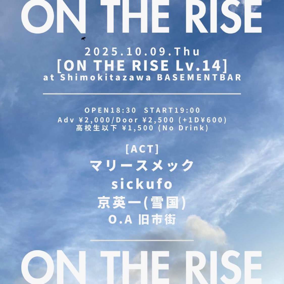2025/10/09【ON THE RISE Lv.14】下北沢BASEMENTBAR live-ufo 2025.09.172025.09.28 ON THE RISE Lv.14 20251009「ON THE RISE Lv.14」下北沢BASEMENT BARAct/sickufo京英一(雪国)旧市街(O.A)マリースメックOPEN18:30/START19:00ticket前売¥2,000/当日¥2,500(+1D)高校生以下¥1,500 pic.twitter.com/DuudGN4SER— 𝙨𝙞𝙘𝙠𝙪𝙛𝙤 (@sicufo) September 17, 2025