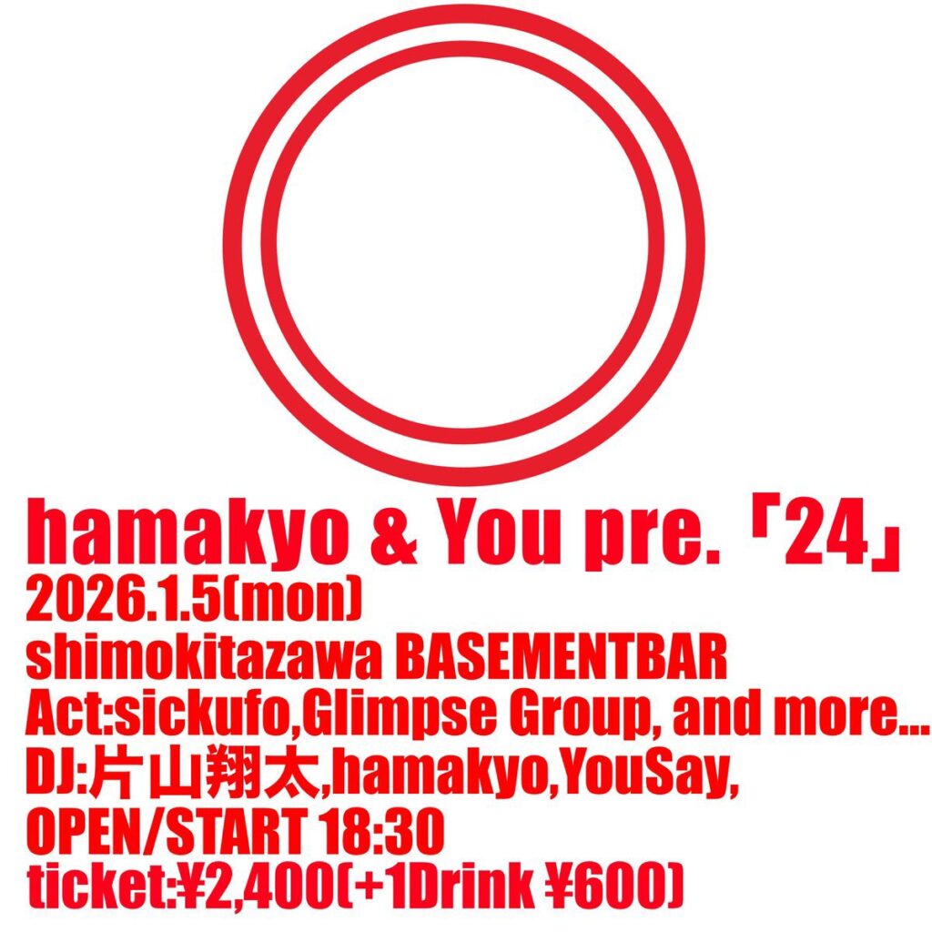 2026/01/05【hamakyo&You pre. 「24」】下北沢BASEMENTBAR live-ufo 2025.12.192026.01.11 下北沢BASEMENTBAR 20260105hamakyo&You pre. 「24」@下北沢BASEMENTBARAct•sickufo•Glimpse Groupand more…DJ•片山翔太•hamakyo•YouSayand more…OPEN/START 18:30Ticket ¥2,400+1Drink(¥600) pic.twitter.com/PXGFD0v9kj— 𝙨𝙞𝙘𝙠𝙪𝙛𝙤 (@sicufo) December 19, 2025